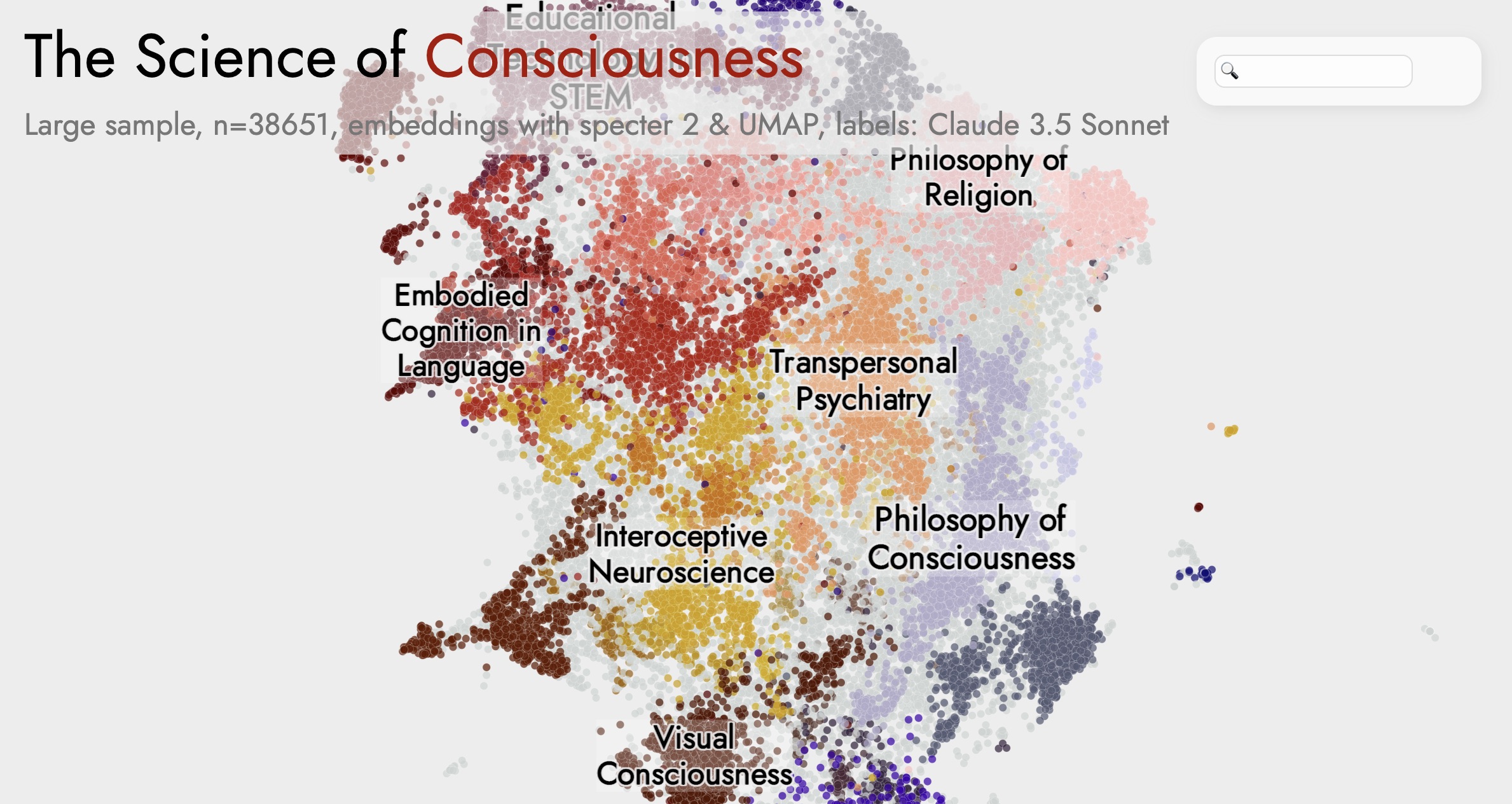 Research map by Max Noichl & Moritz Kriegleder showing how 38,651 consciousness papers cluster. Use it to locate related sources while comparing theories.